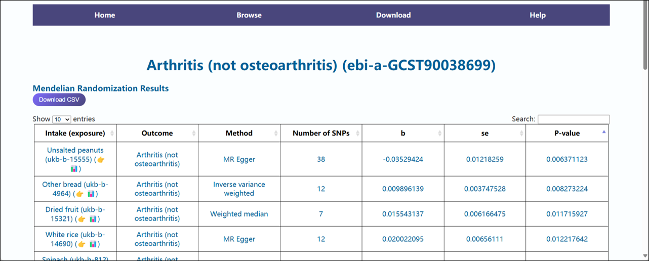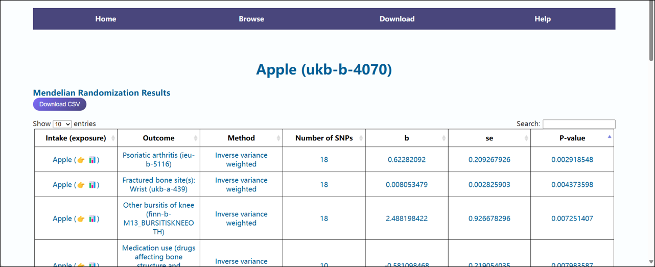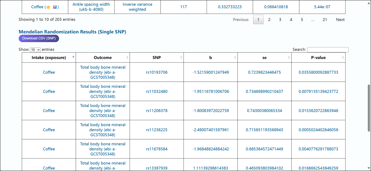 (2) Enter the query result page, and click the "Download CSV (SNP)" button at the title of the second table to obtain all the information of this table